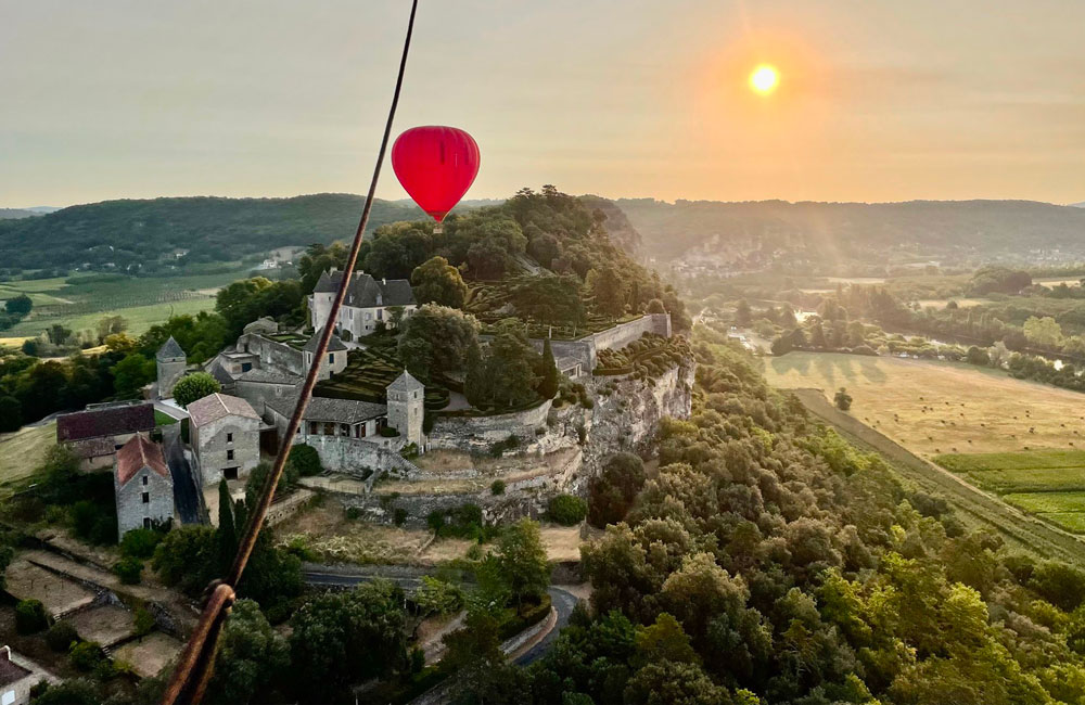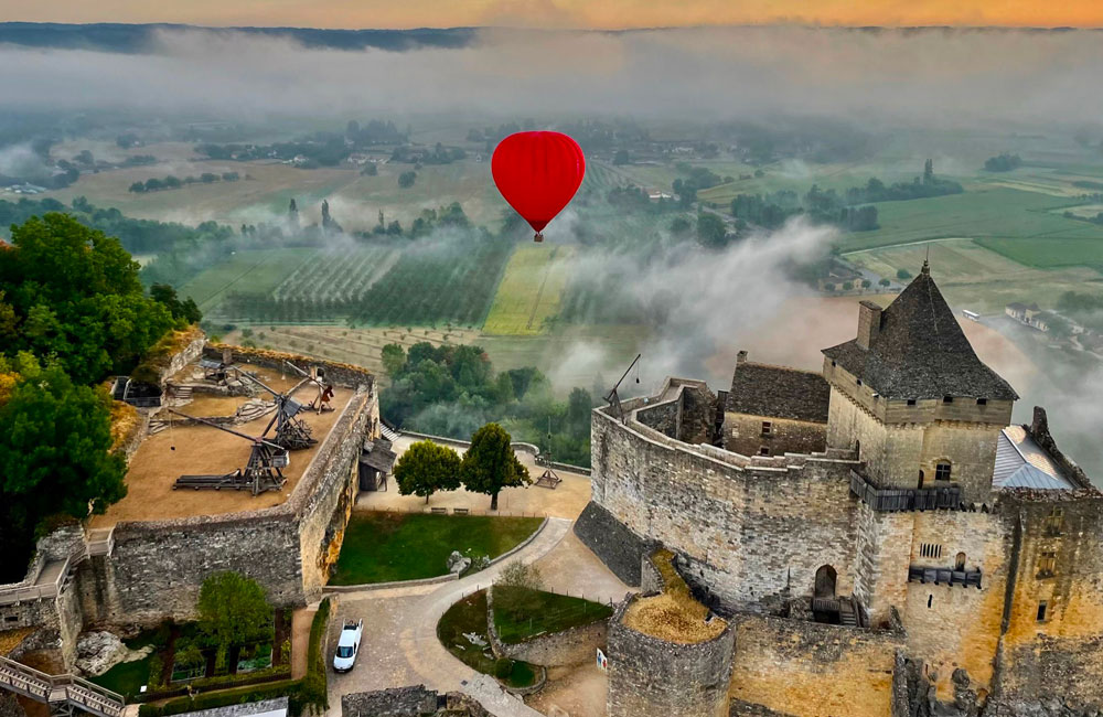 Survoler en montgolfière le monumental Château de Beynac sur les hauteurs…